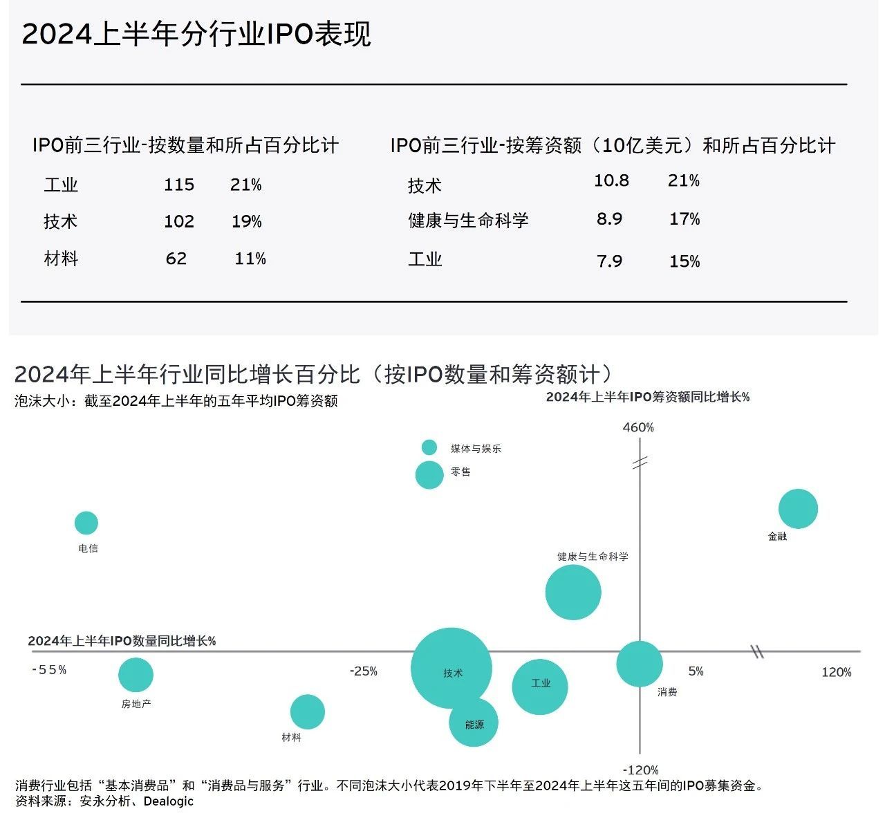 2024年上半年,工业、技术与材料行业引领IPO活动;主要行业中,美国和印度市场占据主导地位